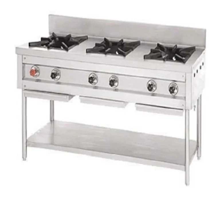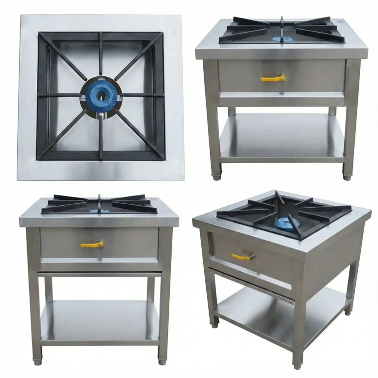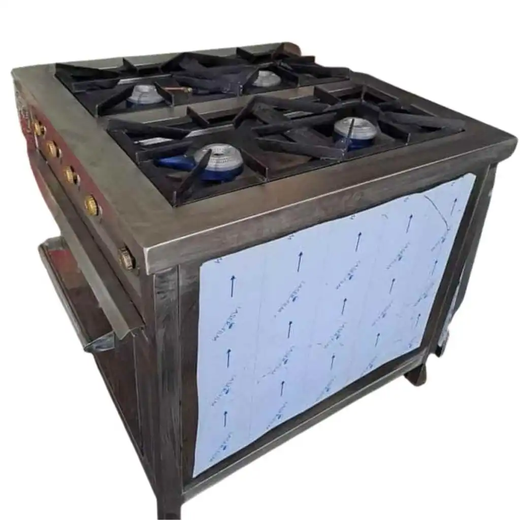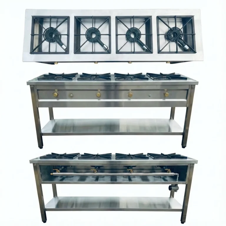 Stainless steel four-burner gas stove by Comkieng Solutions, built for fast, efficient, and heavy-duty cooking in commercial and professional kitchens.